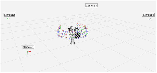 This section provides a detailed description of the setup used for acquiring the dataset, as well as the process involved in the acquisition. Both the synthetic and the real datasets were acquired by collecting a series of images of a planar calibration pattern mounted by means of a custom 3D-printed mount on the gripper of a robot arm. The workcell was equipped with a camera network of four sensors directed towards the manipulator Franka Emika’s Panda (https://www.franka.de/, accessed on 1 May 2023), which was placed in the center of the robotic workcell. The robot was controlled using the Robot Operating System (ROS) middleware [34]. It allowed us to guide the robot’s end-effector along a pre-planned trajectory during each image acquisition, guaranteeing that the calibration pattern faced the cameras at all times. Specifically, the pre-planned trajectory was carefully designed to cover the most of the robot workspace, following a hemispherical path that allowed us to calibrate a camera network with various sensor positions and orientations around the robot. In particular, each acquisition consisted of 250 robot poses that were obtained by densely sampling the robot motion, as illustrated in Figure 1.