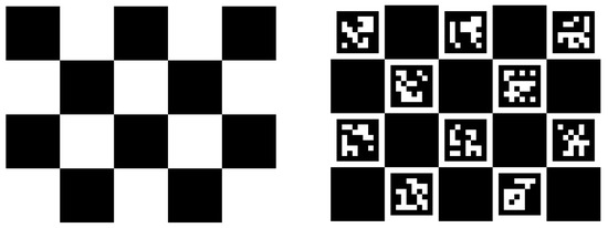The planar calibration pattern used in both datasets was an A4-sized sheet. This was done to facilitate the robot arm movement. A larger calibration pattern could potentially cause collisions between the pattern and surrounding objects or even with the robot itself. The use of a small calibration pattern significantly contributes to make the dataset more challenging and to evaluate the robustness of calibration algorithms. Each acquisition was performed twice with two different calibration patterns. The ChAruCo pattern and the classical checkerboard shown in Figure 2 were used, which are the two patterns most commonly used in the literature for calibration processes.