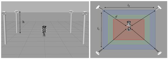 The purpose of this dataset section is to provide synthetic data to evaluate the robustness of various camera network and robot-world hand-eye calibration methods at increasing distances between the sensors and the robot base. The simulated environment was diffusely illuminated by placing a sun model, provided by the Gazebo simulator, at a distance of 10 meters from the ground, avoiding the creation of potential shadows. This approach was chosen to focus the experiments and robustness evaluations on the distances between the sensors and the robot base. Acquisitions were performed with robotic workcells of different sizes, including small, medium, and large workcells, with varying values of height h of the cameras from the robot base, sensor-robot distance d, and length of the two workcell sides and , as shown in Figure 3 with the corresponding color, and as described in Table 1.