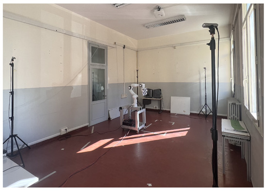The real images were collected to assess the performance of the calibration methods in a real-world scenario where light reflections and image distortions can negatively affect the calibration process. Specifically, we collected data using sunlight as the primary light source through windows, as shown in Figure 4. We also acquired data from two robotic cells of different sizes — one small, similar to the simulated small cell, and the other as large as possible in the laboratory — to evaluate the methods in two possible scenarios, as specified in Table 2.