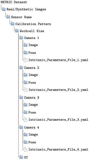 The METRIC dataset consists of over 10,000 synthetic and real images in PNG format, acquired within a robotic workcell by means of several image acquisitions, as described in Section 3. Specifically, the synthetic dataset was collected using a camera network consisting of Microsoft Kinect V2 cameras. The images were captured at the highest resolution possible, namely 1920 × 1280 pixels, without any data processing or adjustments.