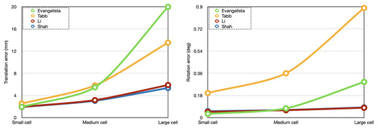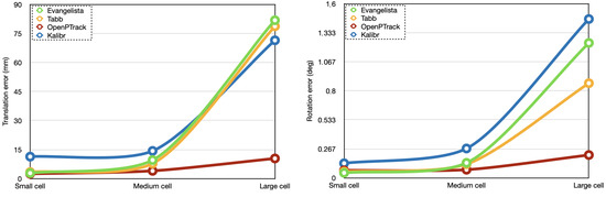 The average translation and rotation errors of the state-of-the-art methods are better illustrated in Figure 6, highlighting how the calibration results are negatively affected by increasing workcell sizes.