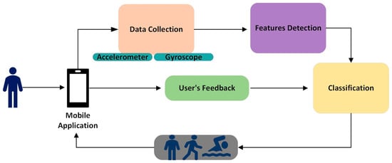 HAR technology analyzes and recognizes several human activities from input data sources, such as sensors [,]. The analysis of the user’s activity provides information about their health status, assisting medical caregivers in providing better treatment. In addition, continuous monitoring in real-time gives the ability to medical professionals to react quicker in cases of emergency []. Additionally, the long-time data collected could lead to the diagnosis and prevention of diseases.