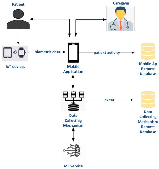 As we can observe, there are two main databases for gathering and storing data. The first one belongs to the mobile application. As mentioned, the mobile device acts as a bridge to collect data from wearable devices via Bluetooth and transmit them to the mobile application’s remote database. The second one is a database that has been built into a cloud server that collects data and makes it available for additional processing, utilizing the MongoDB management system that also handles HTTP for communication between entities [].