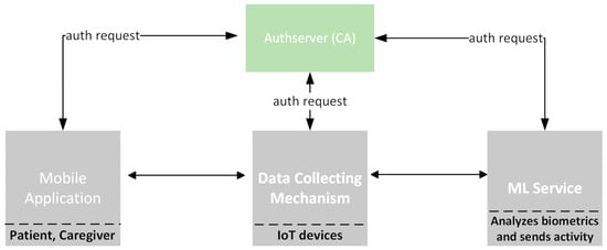 First, we should generate public and private keys for each entity, the patient, the caregiver, the authserver, the data collecting mechanism, and ML service. Figure 4 presents all the participating entities and their interactions. We used the elliptic curve algorithm (ECC), which offers optimal security such as RSA (Rivest–Shamir–Adleman) but utilizes shorter key lengths. Additionally, it requires less computing power and bandwidth than RSA, making it more beneficial for mobiles and IoT devices. Indeed, a public RSA key of 2048-bit offers a security level of 112 bits, while RSA provides a key length of 224 bits.