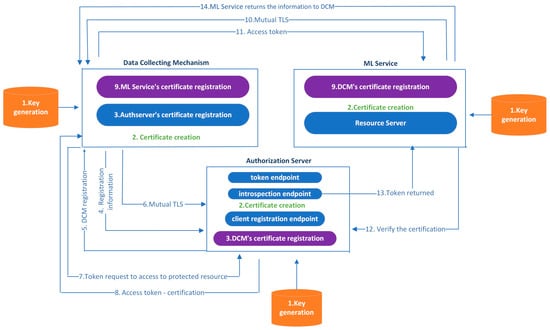 Figure 4 below indicates our proposed solution’s architecture, including the security flow steps. The following is a step-by-step description of the process involved in secure communication between the data collection mechanism (DCM), the authorization server (authserver), and the machine learning service (ML service):