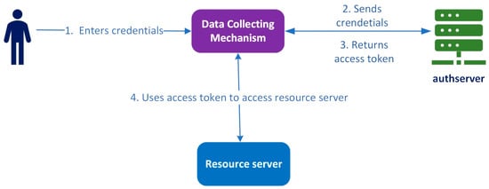Our procedure is based on the OAuth2.0 protocol, which defines a shared-secret method for client authentication [], where the patient and the caregiver input a password (client_secret) and a unique identity (client_id) to a mobile device that has our application, storing this information in its database. Then, it transmits these credentials to the data collecting mechanism, which sends them with identification to the CA of the authserver. Then, the authserver validates this information and returns an access token to the data collecting mechanism. Finally, the data collecting mechanisms use the access token to access the resource server. This process is shown in the following schematic diagram (Figure 5):
