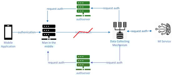 We use X.509 certificates (X.509 V3) via the OAuth2.0 protocol generated by a certificate authority (CA) utilized in authserver. The authserver’s role is to issue access tokens to the mobile application, the data collection mechanism, and the ML service, authenticating the resource owner and obtaining authorization. Downstream of the protocol, the authserver issues access tokens to the data collection mechanism, embedding its certificate. The data collection mechanism uses the access tokens to gain access to the ML service’s information after authenticating with the ML service via mutual TLS 1.3. The ML service finally contacts the authserver to verify the access token presented by the data collection mechanism.