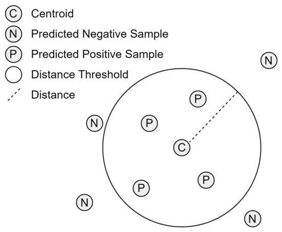 From the training stage of the model, a series of centroids, as well as their respective training distribution values and distance thresholds, are stored. Additionally, the preprocessing models, FA, and PCA models are stored after being fitted from the training dataset. The model is given the sample as input to predict a new test sample, where the preprocessing models transform its feature values. Next, the sample’s features are selected based on the FA and PCA models, which ultimately reduce the number of features that will be observed. To make the prediction, the model implements a K-Nearest Neighbors classifier fitted with the centroids defined by the K-Means algorithm in the training stage. The centroid closest to the transformed test sample is then considered the centroid to which the testing sample belongs. However, if the distance between the centroid and the testing sample is greater than the distance threshold set for the centroid, the testing sample will be considered a negative sample. Conversely, if the distance between the centroid and the testing sample is equal to or smaller than the distance threshold set for the centroid, the testing sample would be considered a positive sample, as seen in Figure 3.