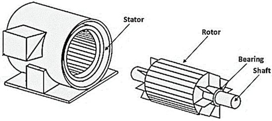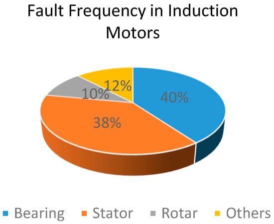 The most common faults that occur in induction motors are bearing faults, stator inter-turn faults, and cracked rotor bars [,]. Bearing failures account for about 40% of faults in induction motors [], while stator, rotor, and other faults comprise roughly 38%, 10%, and 12% of the faults, respectively (see Figure 2) []. In a more detailed breakdown, [] classifies induction motor failures as arising from mechanical or electrical faults. Mechanical faults include bearing failures (caused by incorrect lubrication, mechanical stresses, incorrect assembling, misalignment, etc. []), gearbox failures (for motors with gearboxes), and eccentricity (the rotor is not centered with respect to the stator and/or its rotation is not aligned with the central axis of the stator). Electrical faults may be associated with the stator or rotor. Stator faults include damage to the stator windings (especially insulation) or the drive (speed controller). Rotor faults include broken rotor bars, damage to rotor windings, and broken end rings.