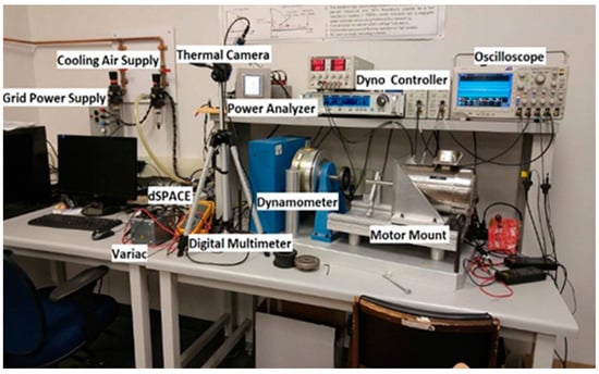 The oscilloscope used for this project is capable of sampling at 100 MHz but was used to sample at 500 KHz for every test except the inrush test. For the inrush test, the oscilloscope was set to sample at 12.5 MHz. The thermal camera used for this project was connected via an Ethernet switch to a desktop where the video feed was saved. Video of the entire experimental sequence was saved for each test, including the 2.5 h warming period for each “hot” test (i.e., sensed data is collected once the motor has reached steady state heat). Finally, a custom mount was built out of aluminum to hold the dynamometer, rails for the mount to slide on, two mounts to bolt the motors onto, and an adjustable rotor lock so that a locked rotor test could be run.