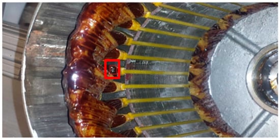 Within the 38% of failures caused by stator faults, the overwhelming majority of them are caused by shorts in the stator []. In order to test if we were able to detect a stator short, motor 3 was opened, and a Dermal was used to strip away some of the insulation between two wires in a winding, and the two wires were soldered together. The solder can be seen outlined by the red box in Figure 4. The motor was then reassembled and run through the same full tests as would be completed in a “hot” test. However, it was also subject to a number of short tests that were run to gather data on the change in impedance from the short caused.