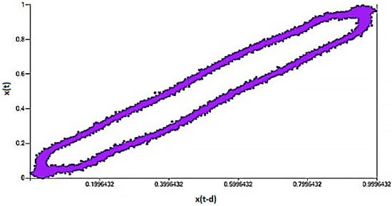 where is the i-th element of the time series. The embedding is repeated for every in the time series (save those at the beginning for which insufficient former examples are available). For a multivariate time series, the embedding process is repeated for each variate, and the delay vectors for each are concatenated together. Per Equation (2), creating a delay vector comes down to finding two important parameters: the delay (d) and the dimensionality (m). Finding d allows us to get an optimal level of autocorrelation within each delay vector (by taking each successive value, or every second, every third, etc.) []. d is determined heuristically, guided by taking the first minimum of the time-delayed mutual information statistic []. A phase plot using that d is then computed to check if there are clear spatial relationships in the data. For example, Figure 6 presents our phase plot for d = 6, in which an elliptical structure is clearly visible. The dimensionality m of the delay vector is mathematically critical; Takens’ result above only holds if m is large enough (at least twice the actual dimensionality of the original state space). The value of m can be determined heuristically by using the false-nearest neighborhood algorithm [,]. In this algorithm, we systematically survey the data points and their neighbors in dimension d = 1, then d = 2, and so on. As the state-space attractor is unfolded, some points originally close together will abruptly separate; these are termed “false nearest neighbors”. The algorithm works by setting a threshold for how large of a sudden separation constitutes a false neighbor, and the heuristic is to find a value m for which the fraction of false neighbors plateaus at a low value across many values of this threshold []. The fraction of false neighbors versus dimensionality m is plotted for our dataset in Figure 7.