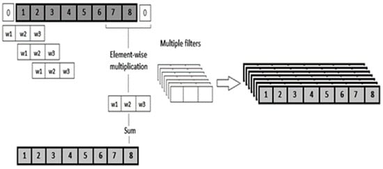 The 1-dimensional CNN is a variation on the CNN architecture for the case of a 1-dimensional signal (e.g., a univariate time series). In Figure 8, a time series (top left) is input to a 1D convolutional layer. A 3-element sliding window implementing the convolution (with weights w1, w2, and w3) is passed over the time series, producing a feature map (bottom left. A single convolutional layer is usually made up of several independent feature maps, each produced by its own kernel (right side). Max-pooling in this architecture will select the larger of two consecutive elements of the time series.