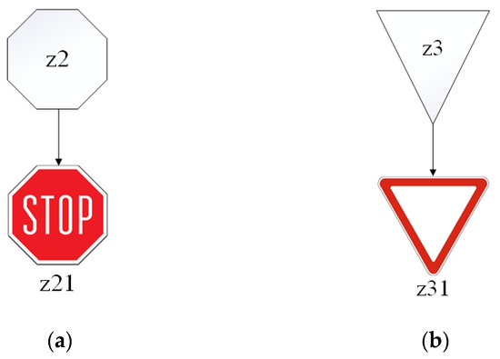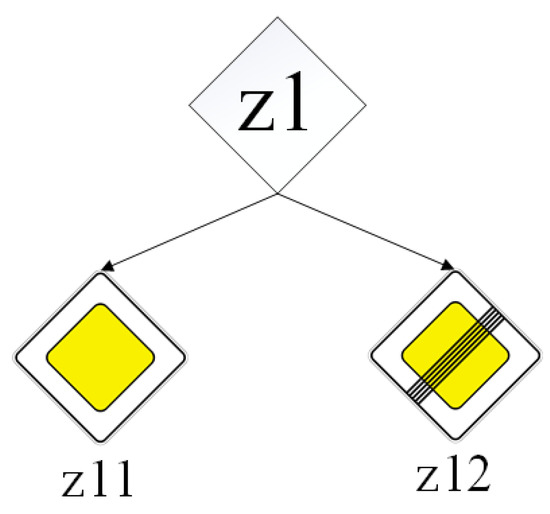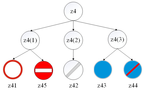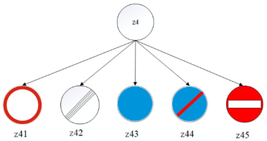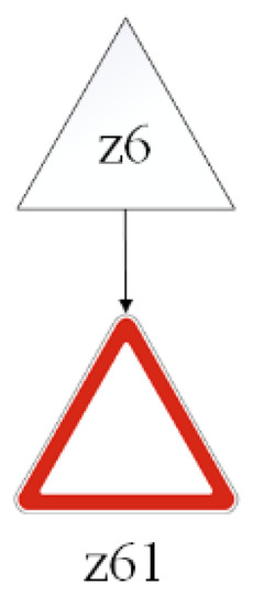 Some second-level classes do not contain the next-level classifiers. Classes and include one traffic sign each (Figure 2). These nodes are the leaves in a hierarchical tree. If the classifier Z assigns a traffic sign to one of these classes, then the recognition problem is solved.