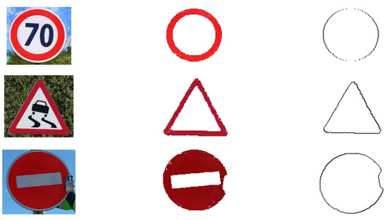 The outer boundary of the edge segment is the boundary of the traffic sign. The edge segment boundary algorithm is reduced to determine the number of neighbors for each pixel in segment . If a pixel in segment has less than eight neighbors from that segment, then it is boundary. The outer edge of the edge segment is separated from the inner edge by the geometric coordinates of the points. The sign boundary in this algorithm has a thickness of one pixel. Examples of edge segments and boundary definition for traffic signs are shown in Figure 9.