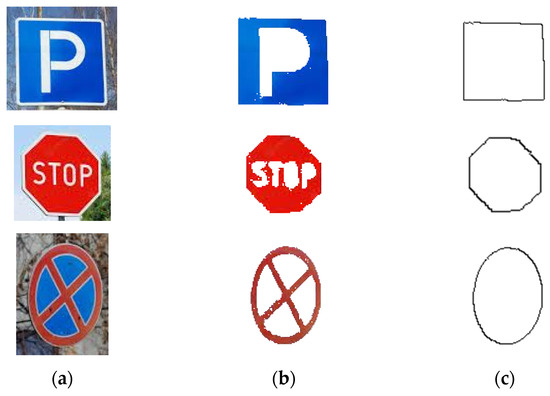 Examples of edge segments and boundary definition for traffic signs: (a) traffic sign images, (b) edge segment of the traffic sign, and (c) traffic sign boundary.