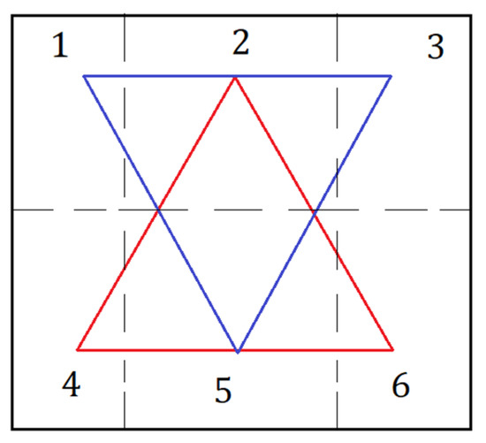 The first step of the algorithm determines the coordinates of the vertices for the triangle , , , and . The traffic sign localization window is divided into six areas (Figure 10).