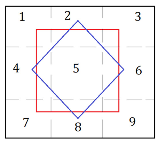 The two types of quadrangular templates and differ from each other in the mutual arrangement of vertices. For a rhombus , two vertices have the same coordinates. The other two vertices have a coordinate greater than and less than this. A square has two pairs of vertices with the same coordinate. The first step of the algorithm determines the coordinates of the vertices for the quadrangle , , , and . The traffic sign localization window is divided into nine areas (Figure 11).