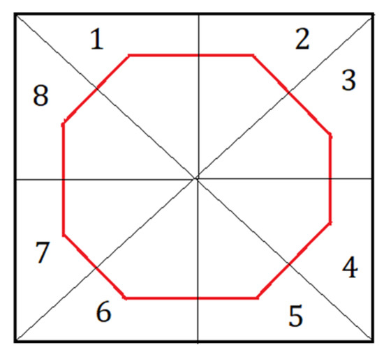 Creating an adaptive octagon template is the most difficult task. The traffic sign localization window is divided into eight areas (Figure 12). The algorithm looks for the farthest contour points from the center . These points are the vertices of the octagon ().
