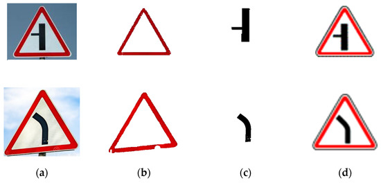 Examples of the algorithm operation for selecting an edge segment and an internal image: (a) a traffic sign image, (b) a traffic sign edge segment, (c) an internal traffic sign image, and (d) an internal image template.