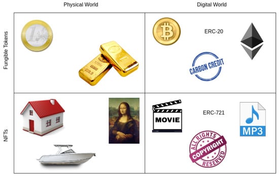 The Ethereum token standards ERC-20 and ERC-721 created two types of tokens on the blockchain (Figure 1): (i) fungible tokens that are identical and can be replaced (such as cryptocurrencies and carbon credits), and (ii) non-fungible tokens (NFTs) that represent a unique asset and cannot be easily exchanged for other tokens (such as music files or copyright certificates). NFTs are like digital IDs registered on the blockchain and cannot be divided further. Despite this, they can be traded using smart contracts on the blockchain, which supports decentralized and secure virtual markets.