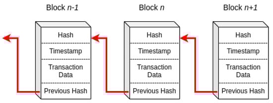 As explained in Section 1, a blockchain is a chain of linked blocks in a distributed and decentralized network. Each block contains data associated with a transaction operation, a cryptographic hash of the previous block (a unique identifier generated using advanced cryptographic methods), and a timestamp of the operation (Figure 2). Since each new block is linked to the previous one, the data in any registered block cannot be changed without affecting its hash code, which would break the link connection with the next block, rendering the change invalid to other nodes in the distributed network. Consequently, a blockchain constitutes a secure and public digital ledger.