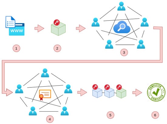 The process of how blockchain technology works is illustrated in Figure 3. When a new transaction request is made (step 1), a new block containing the transaction data is created (step 2). To be registered in the public ledger, the block must first undergo a process called “proof of work” (PoW) in some blockchains (e.g., Bitcoin-like ones) and “proof of stake” (PoS) in others (e.g., Ethereum-like ones), which involves analysis by the nodes in the distributed network (step 3). Nodes that successfully complete the PoW/PoS process receive a reward in the form of cryptocurrencies. The block must then be validated by achieving consensus among the nodes in the network (step 4). If a block is found to be invalid or modified, it will not be added to the blockchain, as it would differ from the copy of the valid blockchain that each node stores. The combination of secure hashing, a PoW/PoS process, and a consensus mechanism in a peer-to-peer network makes it extremely difficult to alter a block within a blockchain. Once validated, the new block is added to the blockchain and distributed throughout the network (step 5), and the transaction is considered completed (step 6).