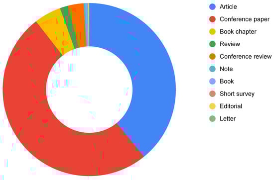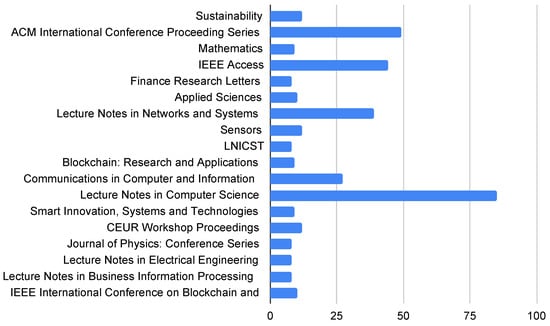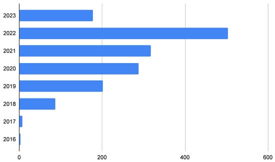 Our search strategy was designed to identify the latest and most relevant research on blockchain-based markets and their efficiency and included three major databases: Web of Science, Scopus, and IEEE Xplore. We limited our inclusion criteria to English-language documents published between 2013 and 2023, ensuring that our review included the most up-to-date and comprehensive research. We focused on identifying relevant books, journal articles, and conference proceedings, both final and in press, to provide a broad and accurate view of the topic. Following our search strategy, we found 1527 articles that contain the keywords “blockchain” and “tokens” in their title or abstract. The vast number of articles makes it difficult to review them manually, so we utilized state-of-the-art topic modeling techniques to automatically extract a selection of topics from this collection of documents (corpus). Specifically, we used the Non-negative Matrix Factorization (NMF) algorithm [], one of the most popular approaches in topic modeling, to gain a better understanding of the underlying themes and patterns present within the corpus, which can be used for further analysis or generate new insights. Figure 4, Figure 5 and Figure 6 graphically represent the information related to this first step of the content analysis of the literature review.