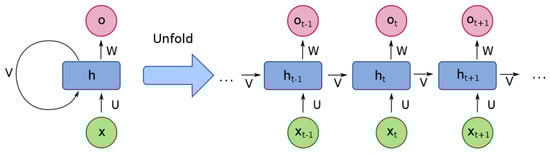 The figure depicted in Figure 1 shows the unfolding of a unit (neuron) in an RNN, with the input state (x) at the bottom followed by the hidden state (h) and the output state (o) at the top. The weights of the network are denoted by U, V, and W, while the t refers to the recurring step. The figure shows a compressed diagram on the left and the unfolded version on the right [58,59].