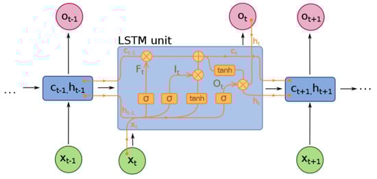 Figure 2 depicts an LSTM unit in an LSTM network, showing the input state (x), hidden state (h), and output state (o). The recurring step is denoted as t. The LSTM unit is equipped with a three-fold gate mechanism, namely the forget gate (), the update gate (), and the output gate (), to process the input variables , , and . The activation functions of the gates are either sigmoid functions () or hyperbolic tangents (), as indicated by sources [60,61].