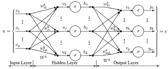 As depicted in Figure 4, an MLP network can be visualized as a directed graph with the input nodes (x) representing the features, hidden nodes (h) representing intermediate representations, and output nodes (y) representing the predictions or target variables. Activation functions, such as the sigmoid (), hyperbolic tangent (), or rectified linear unit (ReLU) functions, are used to introduce non-linearity into the network, enabling it to learn complex patterns.