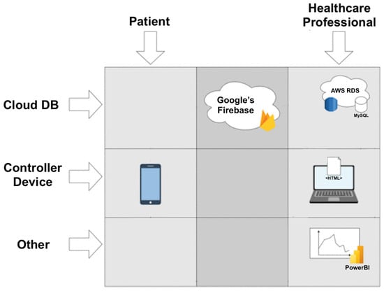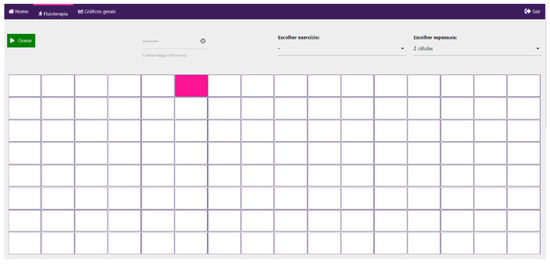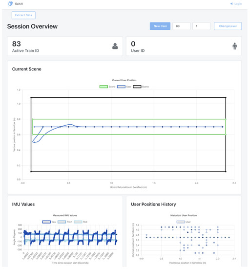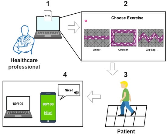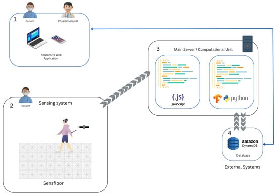 The system’s architecture, as depicted in Figure 5, is divided into four blocks. Block 1 represents the applications where both the user and the physiotherapist interact with the system. This interface allows for visualization of the training performance and configuration of various training parameters.