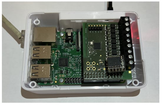 - SensFloor® Raspberry hat unit (Figure 8): This unit collects data from the textile sensor layer and communicates with external devices. The control unit contains analog-to-digital converters (ADCs) that convert capacitance signals into digital data. It also includes a microcontroller for data processing and a communication interface for sending processed data to external devices like the Raspberry Pi in our setup.