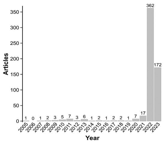 Upon examining the dataset detailing the annual number of publications that address the metaverse, a distinct pattern of exponential growth emerges (see Figure 1). This trend is particularly pronounced from 2020 onwards, culminating in the most recent figures from March 2023. Initially, the data reveals a relatively modest increase in metaverse-related publications between 2005 and 2017, averaging 2.6 publications per year. This period was characterized by the nascent stages of metaverse research, with scholars and technologists beginning to explore the potential of virtual environments and their integration with the physical world [21,87,88]. The subsequent years, 2018 through 2020, evinced a modest but noticeable uptick in metaverse-related publications, averaging 3.3 publications per year. This acceleration is likely attributable to the emergence of VR and AR technologies, which facilitated more immersive and interactive experiences within the metaverse [89].