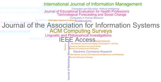 Figure 2 shows a word cloud of the most influential journals publishing academic articles on the metaverse, where the magnitude of the label matches the number of citations. Foremost among these publications is the Journal of the Association for Information Systems, which boasts an impressive 287 citations, indicative of its pivotal role in disseminating knowledge pertinent to the intersection of metaverse and information systems research. Closely following are ACM Computing Surveys and IEEE Access, with 220 and 253 citations, respectively. These journals are renowned for their contributions to the computing and engineering disciplines and have evidently expanded their scope to encompass the nascent metaverse domain, further demonstrating the multifaceted nature of this field. The Technological Forecasting and Social Change journal, amassing 125 citations, reflects a growing interest in understanding the societal implications and future developments of metaverse technology. Similarly, the International Journal of Information Management, with 176 citations, underscores the importance of managing information within the context of the metaverse, given its complex and rapidly evolving nature. References to the Journal of Educational Evaluation for Health Professions, with 126 citations, reveal the potential of metaverse research in revolutionizing educational practices and assessment methodologies, particularly within health professions. This highlights the transformative capacity of the metaverse in areas beyond entertainment and communication. Lastly, the Journal of Marketing Management and the Electronic Commerce Research journal, accumulating 97 and 96 citations, respectively, exemplify the commercial implications and economic opportunities stemming from the metaverse. These publications showcase a burgeoning interest in leveraging the metaverse to bolster marketing strategies and facilitate novel electronic commerce paradigms.