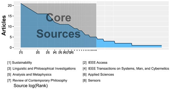 Bradford’s law can be used to evaluate scholarly output, as stated by Kumar and Dora [94]. This law originates from the necessity of identifying pertinent journals that release articles related to a subject matter during a certain research period [95]. As per the law: […] if scientific journals are arranged in order of decreasing productivity of articles on a given subject, they may be divided into a nucleus of periodicals more particularly devoted to the subject and several groups or zones containing the same number of articles as the nucleus [96] (p. 85).