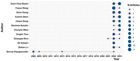 Figure 4 highlights the most productive authors in metaverse research, with a focus on the number of publications they have produced. Most of the authors started publishing on the topic in 2022, except for Papagiannidis, who published on the subject as early as 2008 [67]. This indicates that the field is a relatively new area of research. This finding aligns with the growing interest in VR and AR technologies, which have led to the development of the metaverse concept. The top three authors in the list, Dusit (Tao) Niyato (Nanyang Technological University), Fei-Yue Wang (Chinese Academy of Sciences), and Zehui Xiong (Singapore University of Technology and Design), have the highest number of publications, with 14, 12, and 12, respectively. Their work has contributed significantly to advancing knowledge on the metaverse. Jiawen Kang (Guangdong University of Technology), Dimitrios Buhalis (Bournemouth University), Chunyan Miao (Nanyang Technological University), Xuemin (Sherman) Shen (University of Waterloo), Yonglin Tian (Chinese Academy of Sciences), Nir Kshetri (University of North Carolina), Zihan Lv (Uppsala Universitet), and Savvas Papagiannidis (Newcastle University) follow the top three, with 8, 6, 6, 6, 6, 5, 5, and 5 publications, respectively. The inclusion of Papagiannidis, who published on the topic in 2008, suggests that the concept of the metaverse has been in existence for some time.