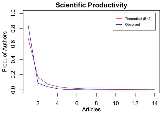 In the current investigation, we used Lotka’s law to quantify the relative concentration of metaverse contributors [97]. Lotka’s law states that, in cases where authors are ranked based on their number of articles, the number of authors publishing n articles should be proportional to 1/2n [98]. In simpler terms, Lotka’s law proposes a negative correlation between the number of authors and their productivity in terms of publications, meaning that fewer authors tend to produce a greater number of publications, while the majority of authors produce only a few publications [99]. Lotka’s law was applied to the metaverse literature using the bibliometrix R package, and the resultant distribution is shown in Figure 5. There are no statistically significant differences between the theoretical and empirical distributions, as determined using the Kolmogorov–Smirnov two-sample test at the conventional 0.05 level of significance. In addition, the extended tail in Figure 5, representing authors who have published only one article, indicates that most scholars might have explored the metaverse as a peripheral research topic [31].