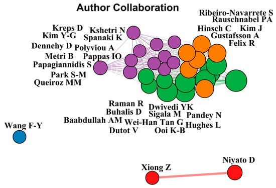 Social network analysis (SNA), which involves the use of multidisciplinary techniques, such as mathematics, computer science, and statistics, is commonly used to examine complex networks. This approach has rapidly gained popularity as a formal analysis technique that can be used to identify hidden patterns and aid in theory development as well as to identify future research directions [54]. In this article, we relied on three important SNA metrics, including network size, density, and diameter [68]. In academia, SNA methods have been widely used, with many studies focusing on co-citations [69,70]. According to Li et al. [71], the knowledge base and research trends of a specified field can be exposed with the help of co-citation networks, which are composed of two articles concurrently cited in a third article. When comparing the semantic similarities of different articles or authors, co-citation networks are very helpful [72]. Changes in a field’s prevailing paradigm can be uncovered by looking at the patterns of co-citations over time [73]. Moreover, the knowledge structure of a field can be exposed through the analysis of source co-citation networks, as noted by Ji et al. [74]. As such, source co-citation networks can be used to visually represent the knowledge patterns that suggest similarities across academic journals, such as methodological approaches and research scope. Collaboration networks are commonly used in bibliometric investigations [75] as a useful tool for graphically representing connections between scholars, academic institutions, and countries. These networks can also be used to show co-authorship relationships among researchers, academic organizations, or countries, which can indicate international collaboration [72]. According to Zou et al. [76], collaborative research efforts can lead to research innovation, high research quality, knowledge diffusion, and other mutual benefits. Additionally, Glänzel and Schubert [77] argued that multi-authored articles are more frequently published in impactful journals and receive more citations compared to single-authored articles. Ding [78] demonstrates that collaboration between academic institutions can promote research partnerships, ultimately aiding policymaking efforts. Additionally, scholars can use keyword co-occurrence networks to identify the core research content or thematic areas in a specific knowledge domain [55]. To further understand how the metaverse field has evolved, researchers can use this powerful data mining approach [79]. In a keyword co-occurrence network, each keyword is represented by a node, and the cluster to which it belongs is indicated by the node’s color. The node size represents the keyword’s occurrence frequency, and the edge’s thickness represents the significance of the relationship between the two keywords.