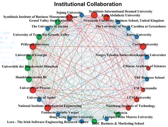 Additionally, Figure 7 illustrates the collaborative network among institutions in the metaverse field, which has a size, density, and diameter of 30, 0.908, and 2, respectively. In contrast to the authors’ collaboration network, the institutional collaboration network appears more cohesive and interconnected, suggesting that institutions are actively forming partnerships and sharing resources to advance research in the metaverse field. The strong collaboration among institutions highlights the importance of fostering connections not only between individual authors but also between academic institutions. Such collaboration can facilitate the sharing of resources, expertise, and funding and ultimately accelerate the progress and development of the metaverse field.