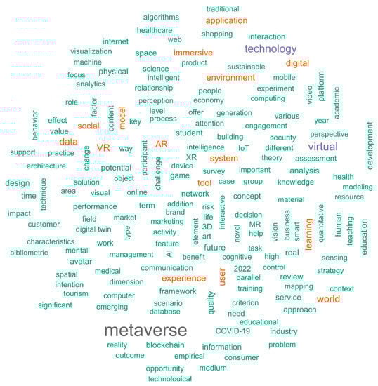 Keywords are crucial in understanding the core themes, trends, and focus areas within a particular research field [31]. They provide a glimpse into the most discussed topics, allowing researchers to identify prevalent issues and key concepts in the literature. By examining the frequency of specific terms in the abstracts of selected articles, we can obtain valuable insights into the current state of metaverse research and its future directions. The word cloud generated from the abstracts of selected articles in the metaverse field is depicted in Figure 8, revealing several dominant terms and concepts. For example, the high frequency of the keyword “virtual” highlights the strong emphasis on the virtual nature of the metaverse and its ability to create immersive digital environments [100]. This is further reinforced by the presence of the keyword “VR” (virtual reality), suggesting that VR technologies play a critical role in the development and exploration of metaverse environments [26,101,102].