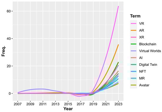 Figure 9 depicts the growth dynamics of keywords in the metaverse field, using the keywords field of all selected articles. The appearance of certain keywords with sudden bursts indicates emerging trends and priorities in metaverse research, as noted by Neff and Corley [103]. Examples of such keywords include VR, AR, XR, and blockchain. These keywords can also signify potential areas of interest or hotspots in metaverse research, as the body of knowledge in a particular academic field can be thought of as a series of ideas that emerge, gain prominence for a time, and eventually diminish [104].