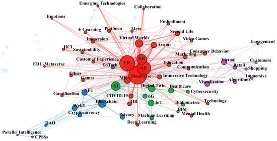 An analysis of the second cluster (blue) unveils a core concentration on the convergence of decentralized technologies, digital assets, and novel paradigms for education and governance. This confluence of themes accentuates the transformative potential of the metaverse and its capacity to reshape existing societal and technological systems [124]. Foremost among the cluster’s keywords are blockchain, NFTs (non-fungible tokens), and cryptocurrency, which collectively epitomize the growing significance of decentralized digital assets within the metaverse ecosystem [110,125,126]. These technologies enable the secure and transparent exchange of value, fostering novel economic systems and empowering users with a greater control over their digital assets. Complementing this focus on decentralization are the concepts of Web3, privacy, and parallel intelligence [127,128,129]. As a decentralized iteration of the internet, Web3 emphasizes the importance of user autonomy and data privacy [130,131], thereby addressing concerns regarding centralization and surveillance. Concurrently, parallel intelligence has emerged as a crucial area of inquiry, encapsulating the intersection of AI and blockchain technology and fostering innovative and collaborative problem-solving approaches [129]. In addition, the cluster emphasizes the increasing relevance of cyber–physical–social systems (CPSSs) and decentralized autonomous organizations (DAOs) within the metaverse [127,132]. Han et al. [127] noted that CPSSs can integrate digital and physical spaces and support synergistic interactions between human and technological agents. Wang [129] argued that DOAs represent a novel paradigm for governance that leverages smart contracts and consensus mechanisms to facilitate decentralized decision making and resource allocation. Finally, the inclusion of EdTech in the cluster alludes to the transformative potential of the metaverse for educational practices. By incorporating decentralized technologies and digital assets, new educational models and platforms can be developed, thereby promoting accessible, personalized, and equitable learning experiences [133].