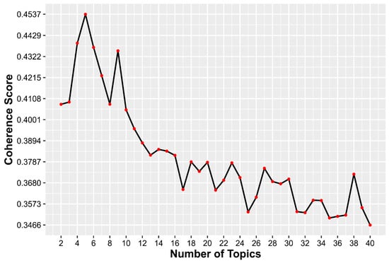 The initial steps of the analysis involved text preprocessing, removing irrelevant elements, and breaking down phrases into individual words using the Python library Gensim. We constructed an effective lexicon, which is crucial for deciphering themes from the texts. Subsequently, we used the Mallet toolset to construct the LDA model and determined the optimal number of topics using the topic coherence score [157]. This process revealed that a model with five topics provides the best balance for analysis (see Figure 11).