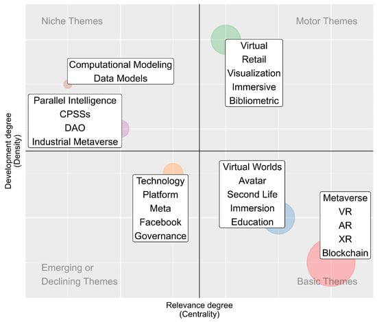A thematic map is a visual representation of the intellectual structure and evolution of a specific field, capturing the interrelations and dynamics among various themes and concepts [30]. The size of the bubbles in the map is indicative of the prevalence and importance of the corresponding themes, while the color represents the distinct clusters that are formed based on their thematic similarity. The thematic map is divided into four quadrants, each representing a distinct category of themes (see Figure 14). The niche themes quadrant encompasses specialized yet less prevalent research areas. In the case of metaverse research, this quadrant contains two bubbles: one representing “computational modeling” and “data models”, highlighting the importance of data-driven approaches in the development and analysis of the metaverse, and a second bubble comprising “parallel intelligence”, “CPSSs”, “DAOs”, and “industrial metaverse”, emphasizing the integration of advanced technologies and systems to enhance the metaverse’s capabilities in industrial applications. The motor themes quadrant represents well-established and influential research areas that drive the field’s progress. In the metaverse research thematic map, this quadrant contains a single bubble that includes keywords such as “virtual”, “retail”, “visualization”, “immersive”, and “bibliometric”. This signifies a focus on practical applications of the metaverse and the importance of bibliometric analysis in understanding the field’s intellectual structure. The basic themes quadrant encompasses fundamental and core research areas that form the foundation of the field. The first bubble in this case includes keywords such as “virtual worlds”, “avatar”, “second life”, “immersion”, and “education”. These keywords highlight the historical development of virtual environments and their applications in education. The second bubble, comprising “metaverse”, “VR”, “AR”, “XR”, and “blockchain”, underscores the key technologies that underpin the metaverse and enable the convergence of immersive experiences. Lastly, the emerging or declining themes quadrant captures research areas that are either gaining momentum or losing relevance over time. This quadrant contains a single bubble with keywords such as “technology”, “platform”, “Meta”, “Facebook”, and “governance”. This cluster highlights the growing influence of technology companies, such as Facebook (now Meta), in shaping the metaverse’s development and the importance of addressing governance issues related to privacy, security, and ethical concerns.