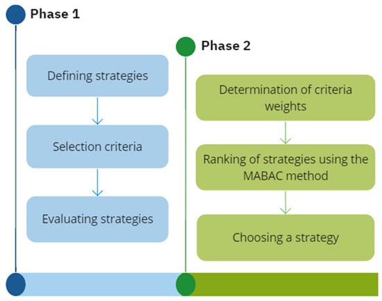 Phase 2. Ranking the strategies. After the strategies were developed and evaluated, and the weights of the criteria were determined, the best strategy had to be selected. The weighting of the criteria was determined in such a way that the decision-maker could determine the importance of each criterion, each expressed as a percentage. These percentages were then transformed into weight coefficients that represent their rational numbers. Since it is debatable which strategy of the competitors to use, it is impossible to say with absolute certainty which of the strategies would be successful. As a result, it is imperative to assess strategic alternatives and select the best strategy in order to outperform the competition and win the contract. The goal, however, was to select the one with the best indicators, which would be accomplished using Pamučar and Ćirović’s [32] MABAC method. The selection of the MABAC method was motivated by its limited utilization within game theory in previous studies, despite its widespread application in other domains. Importantly, the MABAC method aligns with conventional MCDM approaches and can be effectively employed across various fields. A notable advantage of this method lies in its normalization technique, which accommodates negative data values without necessitating preliminary data adjustments. In contrast, alternative normalization approaches require data correction prior to normalization. Since some criteria values are negative, it is necessary to choose a complex linear normalization. The MABAC method is a rational choice since it employs the aforementioned normalization, as opposed to other methods that must be modified to be used in this setting. The purpose of the MABAC method is to rank the alternatives in accordance with their deviation from the average value [33,34], by following six steps [2,35,36].