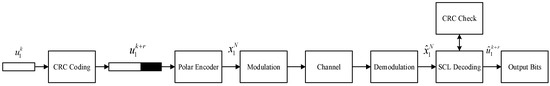 The original bit stream and the CRC check bits with the length of form , which is polar encoded to obtain the codeword sequence . The information bits are modulated and demodulated and input into the SCL decoder as the sequence (the modulation and demodulation module is described in 2.1), and the SCL decoder provides estimated information bits , , corresponding path metrics , and . If none of the , passes the CRC check, the decoding fails. If only one of them passes the CRC check, the estimation that passes the CRC check is chosen as the decoding result. If multiple estimations pass the CRC check, the estimation with the minimum metric value is selected as the decoding result among those that pass the CRC check.