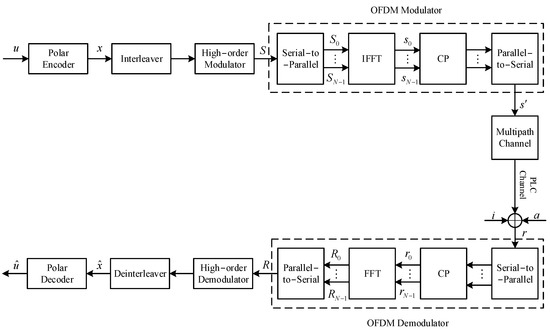 On the other hand, with the continuous development of modern digital signal processing technologies such as modulation and channel coding, Orthogonal Frequency Division Multiplexing (OFDM) technology is considered to be an effective method for solving problems such as noise, multipath propagation, and frequency-selective fading in PLC [12]. In [13], the performance of using OFDM in PLC channels was analyzed and compared with single-carrier modulation systems, and the authors pointed out that OFDM outperformed single-carrier modulation in terms of BER performance. For channel coding, the authors in [14] proved that modeled PLC channels can have good image transmission capabilities with the help of LDPC coding. In [15], the authors compared the performance of LDPC codes and Turbo codes in the PLC environment and proved that the performance of LDPC codes can approach that of Turbo codes with higher block lengths. In [16], OFDM technology with subcarrier mapping using BPSK and QAM achieved excellent performance by introducing LDPC codes in error correction coding. Recently, after Arikan et al. invented polar codes [17], many studies have shown that polar codes can achieve good performance when applied to PLC systems with impulse noise. Niu K et al. [18] evaluated the BER performance of polar codes against impulse noise, but only in single-carrier scenarios. Furthermore, they solved the problem of limited single-carrier scenarios in [18] by introducing polar coding in OFDM-based multi-carrier PLC systems and discussing Successive Cancellation (SC) decoding techniques [19]. Based on this, two decoding methods, Successive Cancellation List (SCL) and Successive Cancellation Stack (SCS), were proposed to improve the performance of polar codes. In addition, A. Hadi et al. [20] pointed out that soft decision decoding is superior to hard decision decoding, and performance can be further improved with increasing code word length. They also proved that polar codes have stronger capabilities than other codes in correcting errors caused by impulse noise in PLC systems.