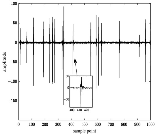 where is the time at which the impulses arrive, which needs to be determined by measuring the data, and can be represented by a random variable to reflect the randomness of impulse noise. The impulse parameter is introduced to characterize the probability of impulse arrival time within a signal period , . Then, the number of impulse noise occurrences in one period can be represented as . Figure 3 shows the simulated PLC random impulse noise waveform generated when , and the inset shows the waveform of a single impulse noise generated by (13).